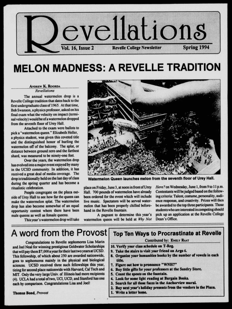 Evaluations ! Vol. Issue 16, 2 II Reveille College Newsletter I II I Willful Spring 1994 Met. ON MADNESS: A REVEILLE TRADITION ANDREW. Room Revelations The annual watermelon drops a Reveille College