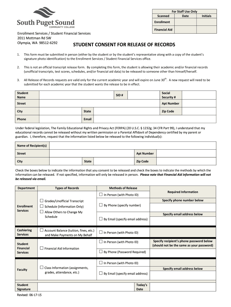 Scanned For Staff Use Only Date Initials Enrollment Financial Aid Enrollment Services / Student Financial Services 2011 Mott man Rd SW Olympia, WA 985126292 STUDENT CONSENT FOR RELEASE OF RECORDS