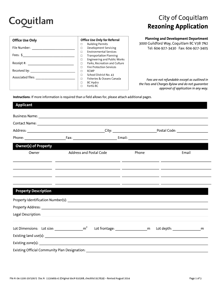 City of Coquitlam Rezoning Application Office Use Only for Referral Office Use Only File Number: Fees: $ Receipt #: Received by: Associated files: Building Permits Development Servicing Environmental