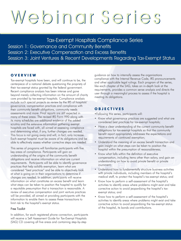 Webinar Series Tax-exempt Hospitals Compliance Series Session 1: Governance and Community Benefits Session 2: Executive Compensation and Excess Benefits Session 3: Joint Ventures & Recent Developments