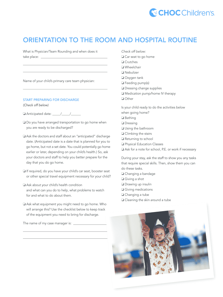 ORIENTATION TO THE ROOM AND HOSPITAL ROUTINE What is Physician/Team Rounding and when does it Check off below: take place: C oar seat to go home o Crutches Name of your children primary care team