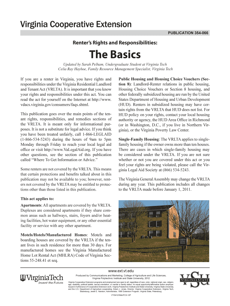 PUBLICATION 354066 Renters Rights and Responsibilities: The Basics Updated by Sarah Pelham, Undergraduate Student at Virginia Tech Celia Ray Hay hoe, Family Resource Management Specialist, Virginia