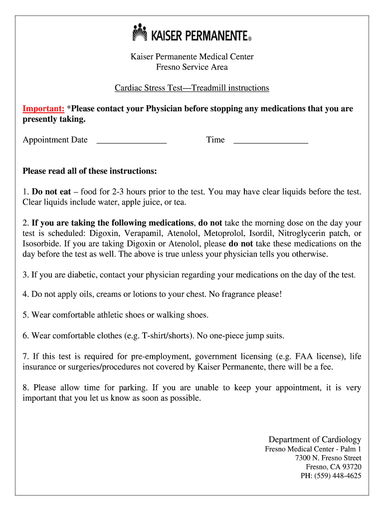 Kaiser Permanent Medical Center Fresno Service Area Cardiac Stress TestTreadmill instructions Important: *Please contact your Physician before stopping any medications that you are presently taking.
