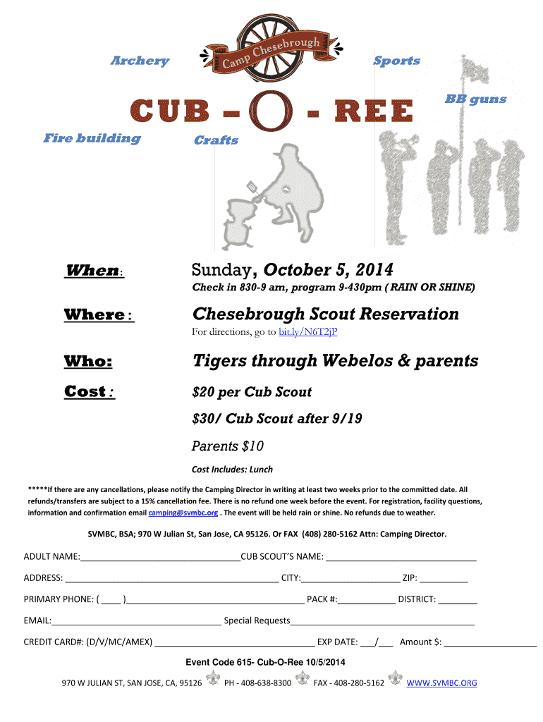 Archery Sports CUB Fire building When: O FREE BB guns Crafts Sunday, October 5, 2014, Check in 8309 am, program 9430pm (RAIN OR SHINE) Where: Chesebrough Scout Reservation For directions, go to bit.ly/N6T2jP