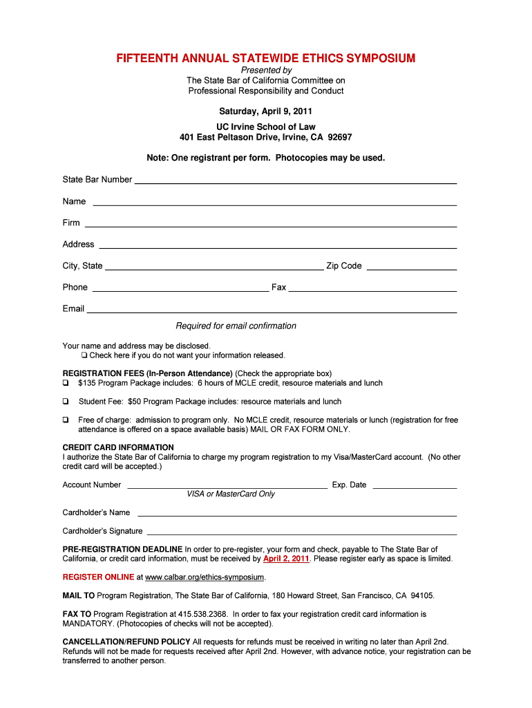 FIFTEENTH ANNUAL STATEWIDE ETHICS SYMPOSIUM Presented by The State Bar of California Committee on Professional Responsibility and Conduct Saturday, April 9, 2011, UC Irvine School of Law 401 East