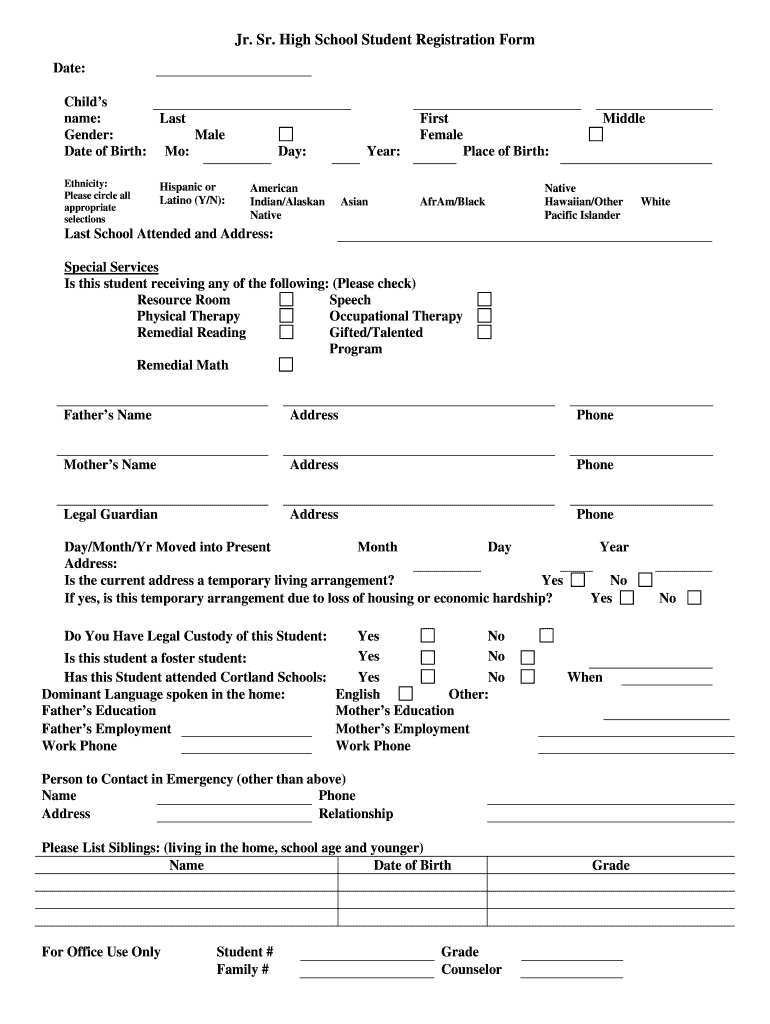 Jr. Sr. High School Student Registration Form Date: Child's name: Last Gender: Male Date of Birth: Mo: Ethnicity: Please circle all appropriate selections Hispanic or Latino (Y/N): First Female Day: