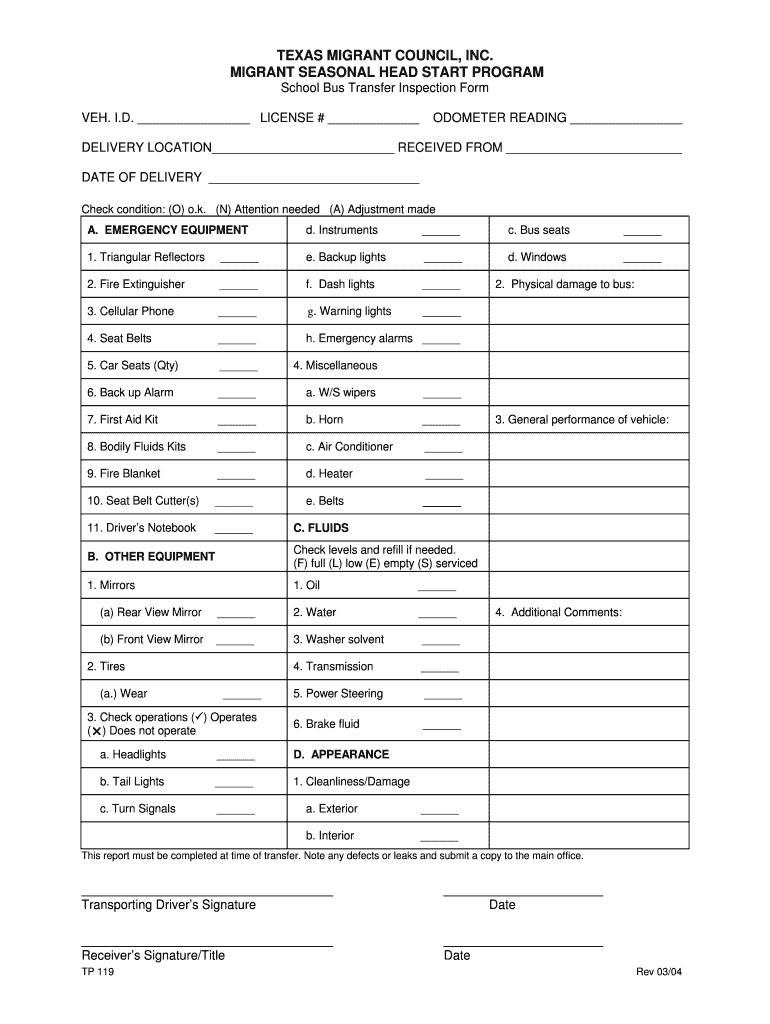 TEXAS MIGRANT COUNCIL, INC. MIGRANT SEASONAL HEAD START PROGRAM School Bus Transfer Inspection Form VH. I.D. LICENSE # ODOMETER READING DELIVERY LOCATION RECEIVED FROM DATE OF DELIVERY Check condition: