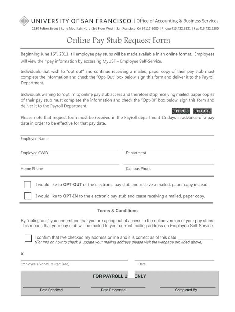 Office of Accounting & Business Services 2130 Fulton Street Lone Mountain North 3rd Floor West San Francisco, CA 941171080 Phone 415.422.6521 Fax 415.422.2530 Online Pay Stub Request Form Beginning