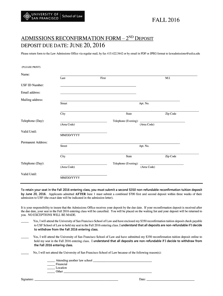 FALL 2016 ADMISSIONS RECONFIRMATION FORM 2ND DEPOSIT DUE DATE: JUNE 20, 2016, Please return form to the Law Admissions Office via regular mail, by fax 415.422.5442 or by email in PDF or JPEG format