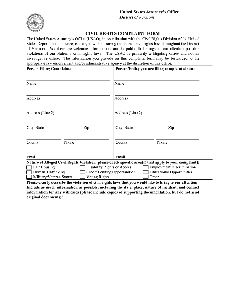 This document is used to file complaints regarding possible violations of civil rights laws to the United States Attorney's Office in the District of Vermont.