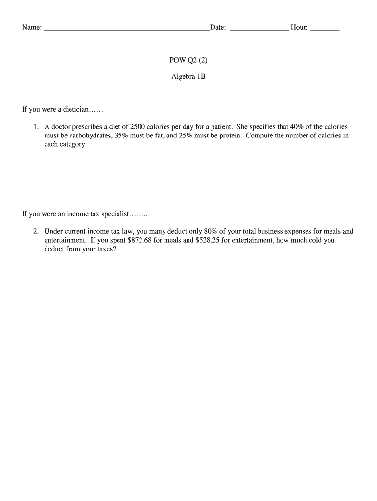 Name: Date: Hour: POW Q2 (2) Algebra 1B If you were a dietician 1. A doctor prescribes a diet of 2500 calories per day for a patient. She specifies that 40% of the calories must be carbohydrates,