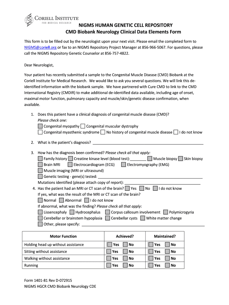 Get the free NIGMS HUMAN GENETIC CELL REPOSITORY CMD Biobank Neurology - catalog coriell