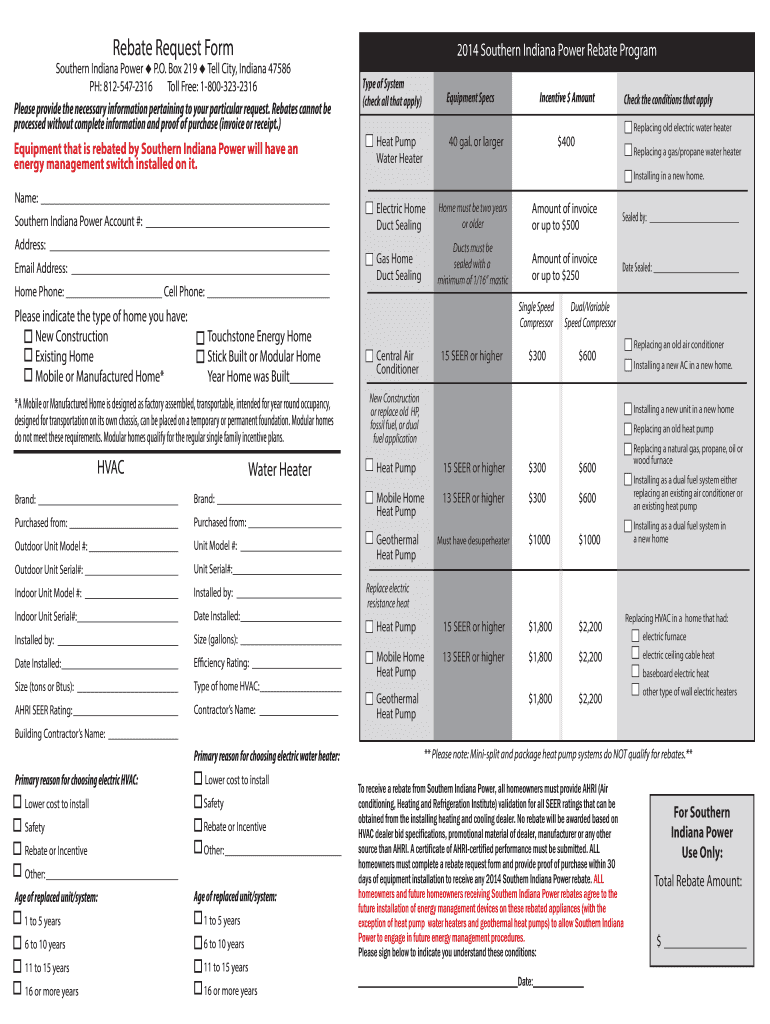 Get the free Rebate Request Form 2014 Southern Indiana Power Rebate Program