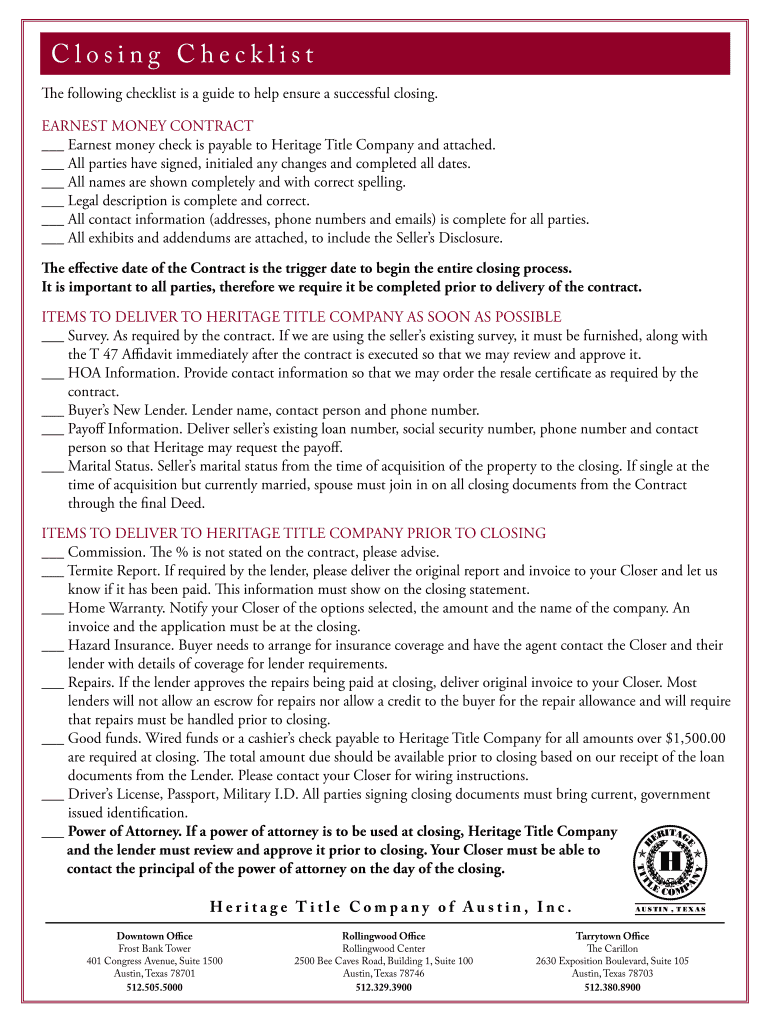 Closing Checklist The following checklist is a guide to help ensure a successful closing. EARNEST MONEY CONTRACT Earnest money check is payable to Heritage Title Company and attached. All parties