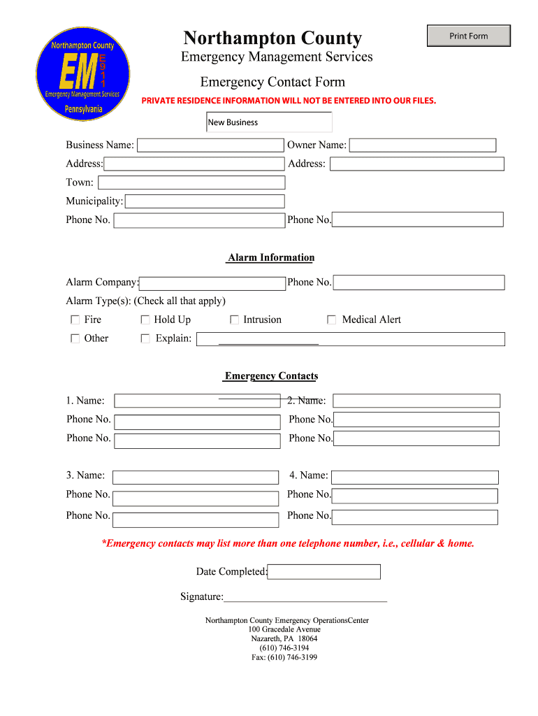 Northampton County Print Form Emergency Management Services Emergency Contact Form PRIVATE RESIDENCE INFORMATION WILL NOT BE ENTERED INTO OUR FILES. New Business Name: Owner Name: Address: Address: