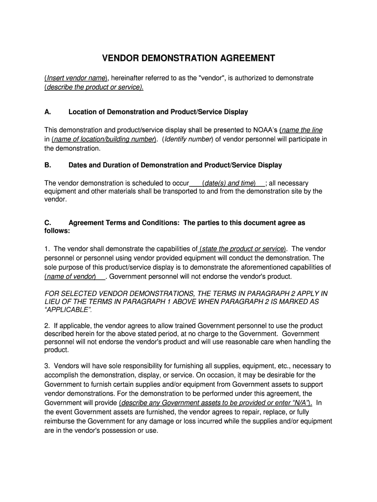 VENDOR DEMONSTRATION AGREEMENT (Insert vendor name), hereinafter referred to as the vendor “, is authorized to demonstrate (describe the product or service). A. Location of Demonstration and Product/Service
