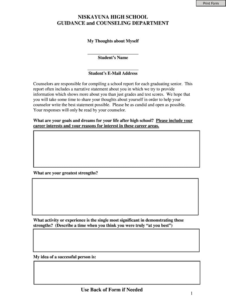 Print Form NISKAYUNA HIGH SCHOOL GUIDANCE and COUNSELING DEPARTMENT My Thoughts about Myself Students Name Students Email Address Counselors are responsible for compiling a school report for each