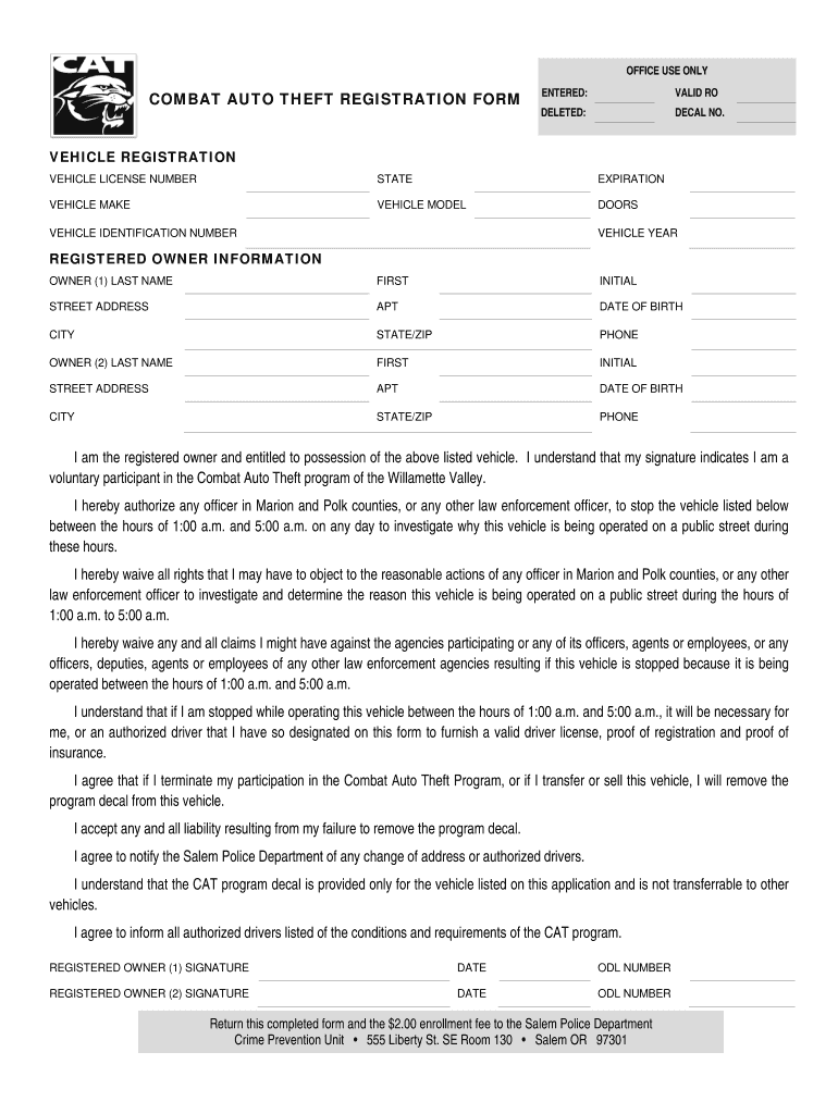 Any registered vehicle owner in Oregon can complete the Combat Auto Theft Registration Form to voluntarily participate in the program and authorize law enforcement checks.