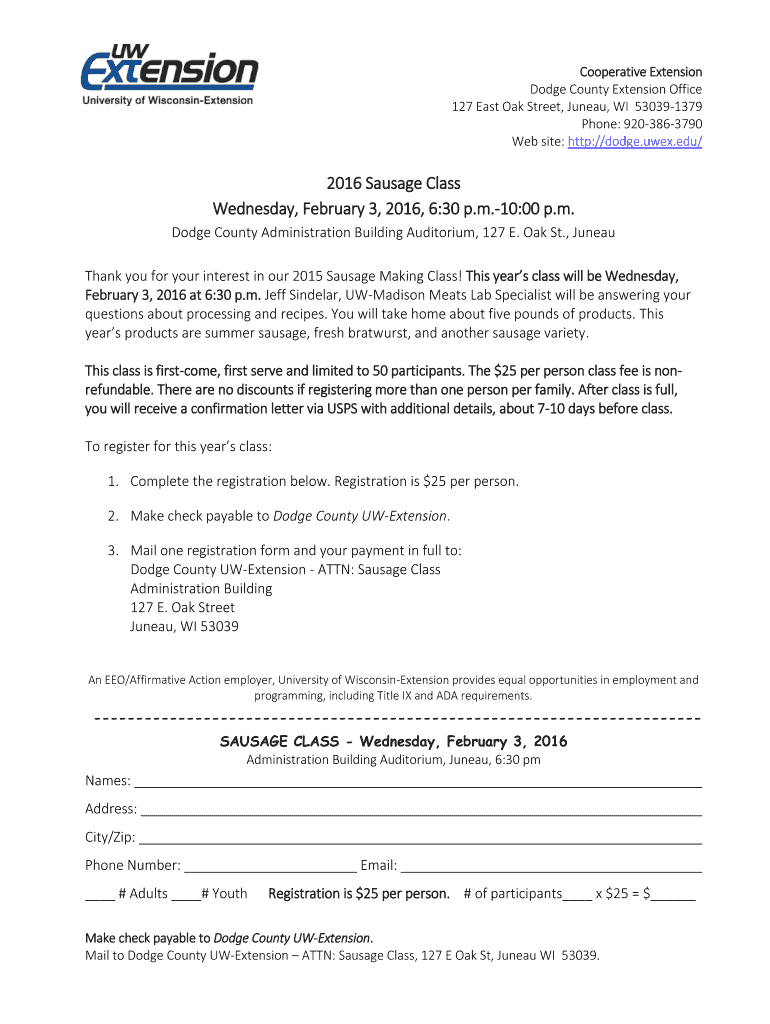 Cooperative Extension Dodge County Extension Office 127 East Oak Street, Juneau, WI 530391379 Phone: 9203863790 Website: http://dodge.uwex.edu/ 2016 Sausage Class Wednesday, February 3, 2016, 6:30