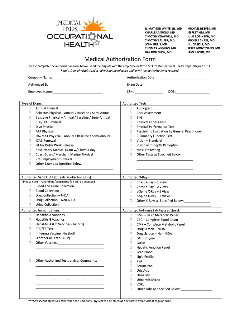 Parents or guardians: If a minor child requires medical treatment or procedures, their parents or legal guardians may need to sign a medical authorization form to provide consent on their behalf.