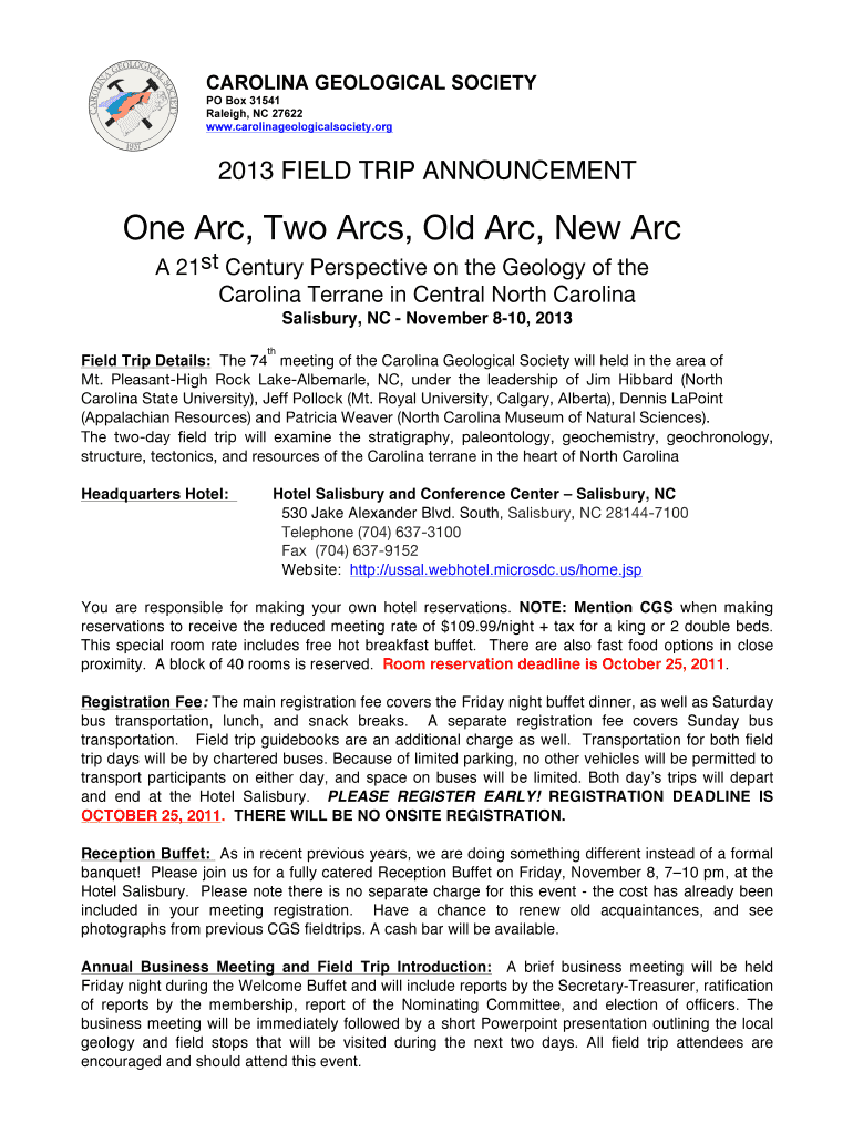 CAROLINA GEOLOGICAL SOCIETY PO Box 31541 Raleigh, NC 27622 www.carolinageologicalsociety.org 2013 FIELD TRIP ANNOUNCEMENT One Arc, Two Arcs, Old Arc, New Arc A 21st Century Perspective on the Geology