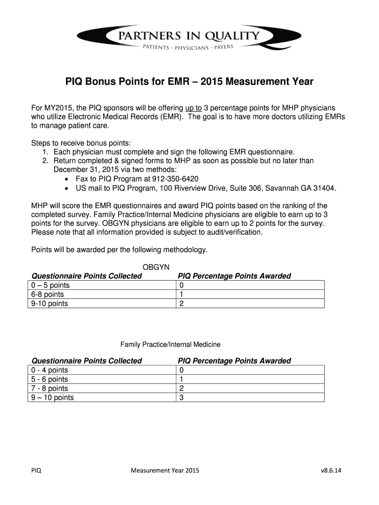 Get the free PIQ Bonus Points for EMR 2015 Measurement Year