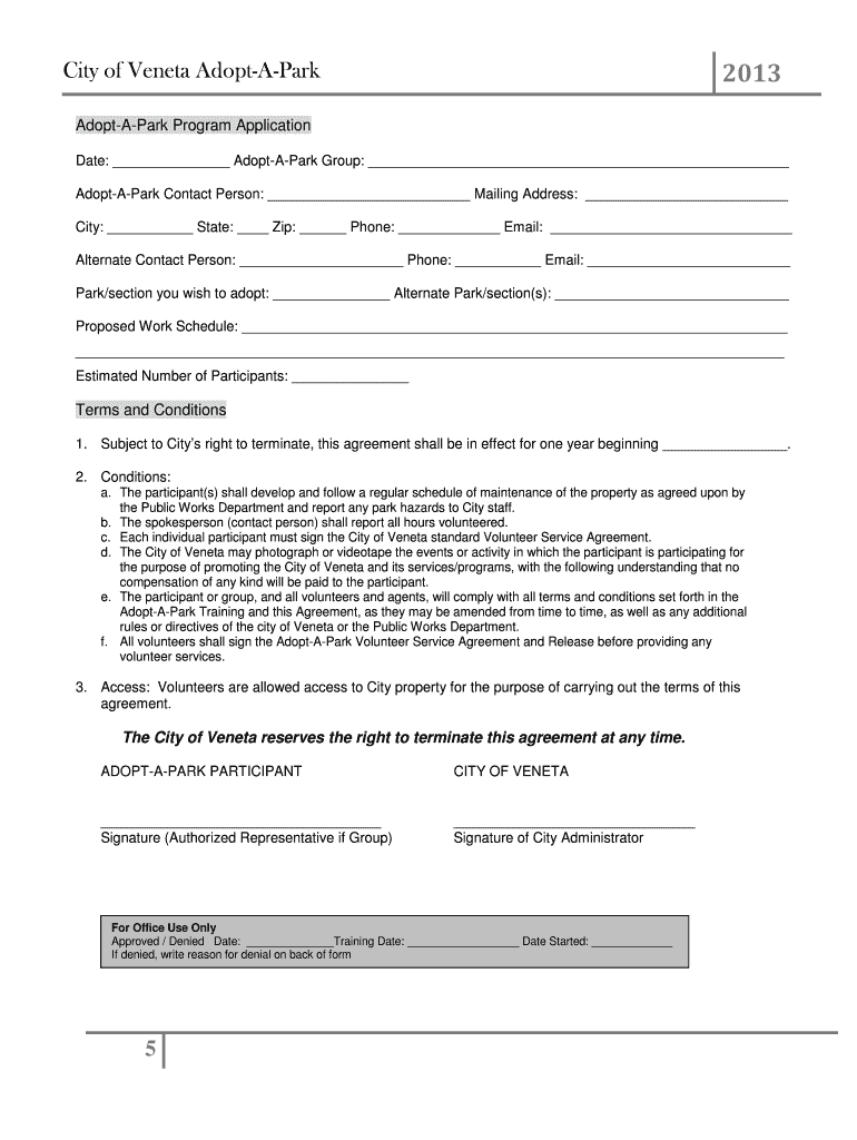 Individuals, community groups, schools, and organizations interested in participating in the Adopt-A-Park program are typically required to file an application or agreement to adopt a specific park.