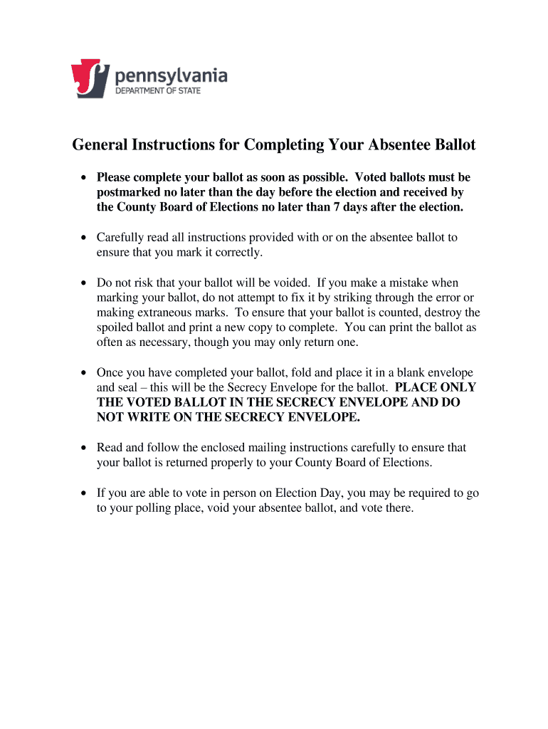 All voters who choose to vote absentee are required to follow the General Instructions for Completing Your Absentee Ballot to ensure their ballot is completed correctly.