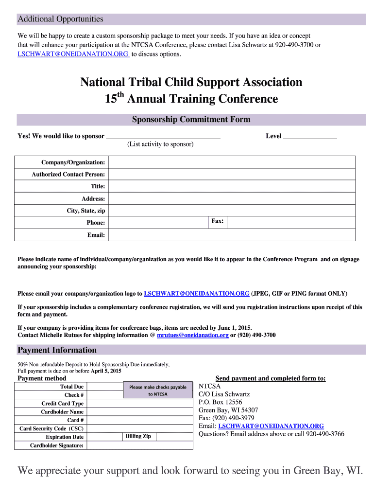 National Tribal Child Support Association 15th Annual Training Conference June 7th 11th, 2015 Sponsorship Opportunities & Benefits Level $15,000 Conference Tote Bag Company Logo on bag (w/NT CSA logo)
