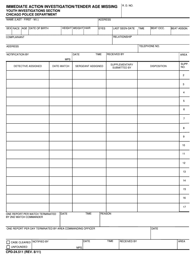 IMMEDIATE ACTION INVESTIGATION/TENDER AGE MISSING R. D. NO. YOUTH INVESTIGATIONS SECTION CHICAGO POLICE DEPARTMENT NAME (LAST FIRST M.I.) ADDRESS HEIGHT WEIGHT HAIR SEX RACE AGE DATE OF BIRTH EYES