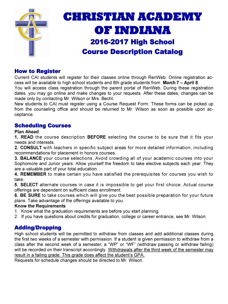 CHRISTIAN ACADEMY OF INDIANA 20162017 High School Course Description Catalog How to Register Current CAI students will register for their classes online through Renewed. Online registration access