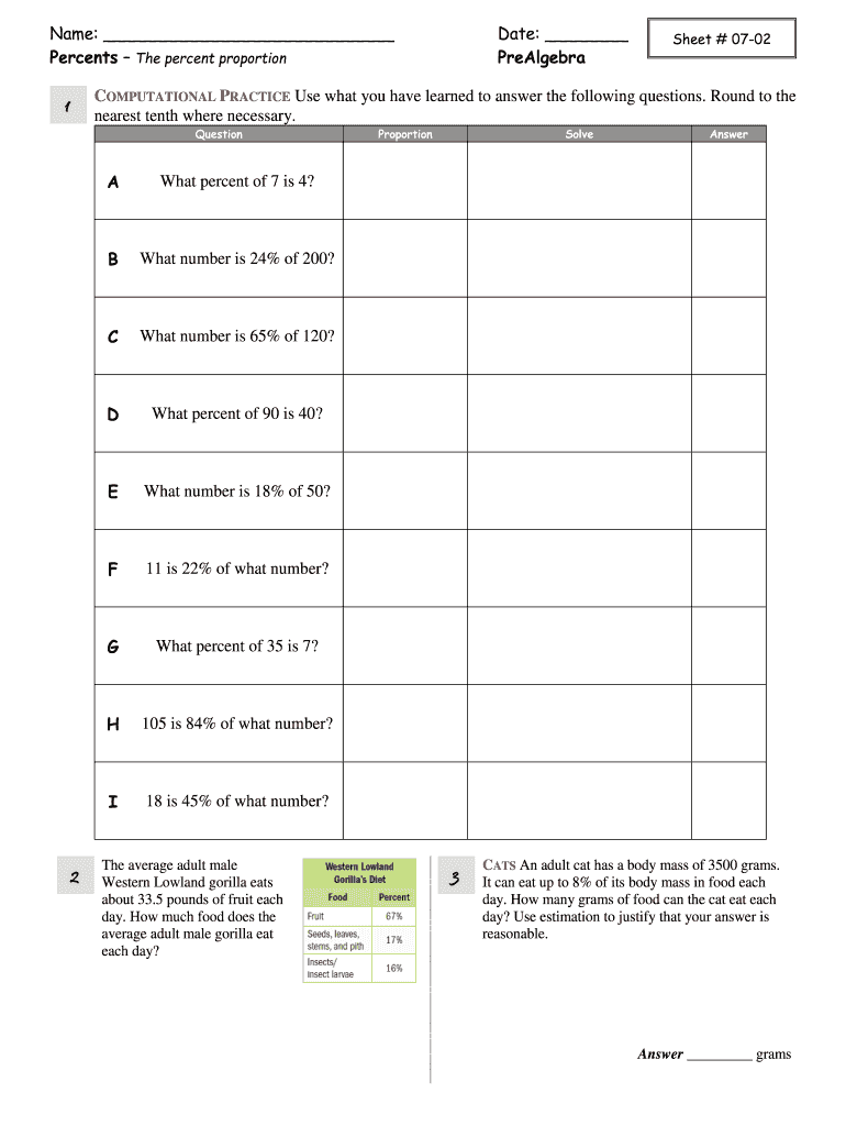 Name: Percents The percent proportion Date: Pre-algebra Sheet # 0702 COMPUTATIONAL PRACTICE Use what you have learned to answer the following questions. Round to the nearest tenth where necessary.