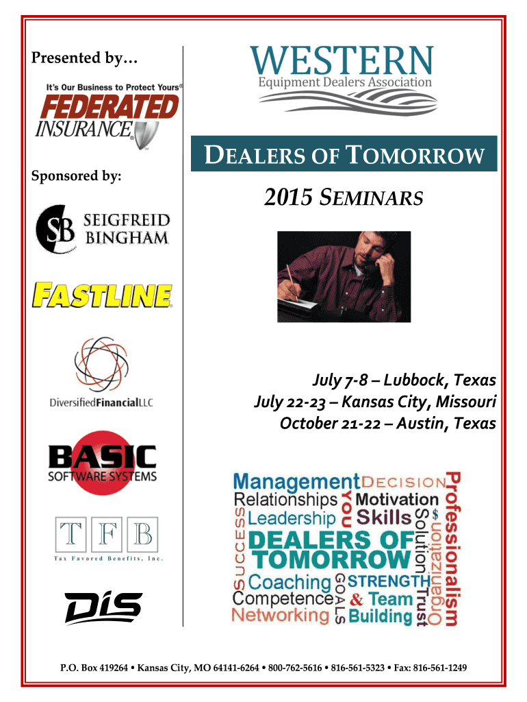 Presented by Sponsored by: DEALERS OF TOMORROW 2015 SEMINARS July 78 Lubbock, Texas July 2223 Kansas City, Missouri October 2122 Austin, Texas P.O. Box 419264 Kansas City, MO 641416264 8007625616