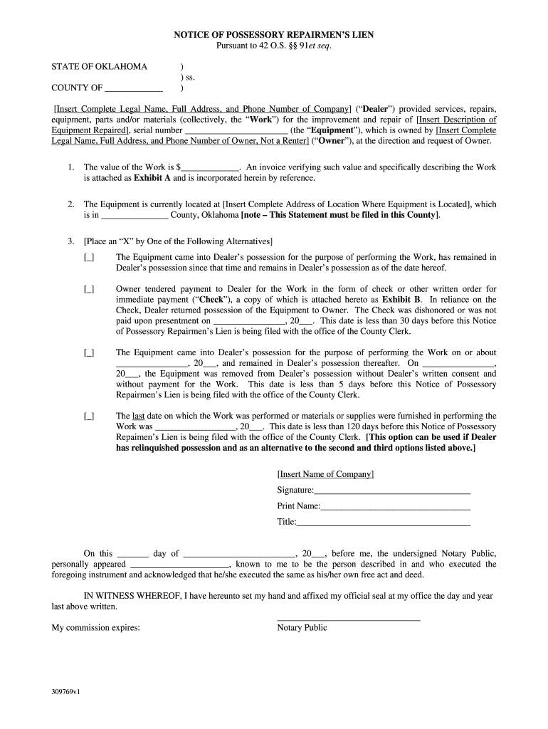 NOTICE OF POSSESSOR REPAIRMEN LIEN Pursuant to 42 O.S. 91et seq. STATE OF OKLAHOMA COUNTY OF)) SS. ) Insert Complete Legal Name, Full Address, and Phone Number of Company (Dealer) provided services,