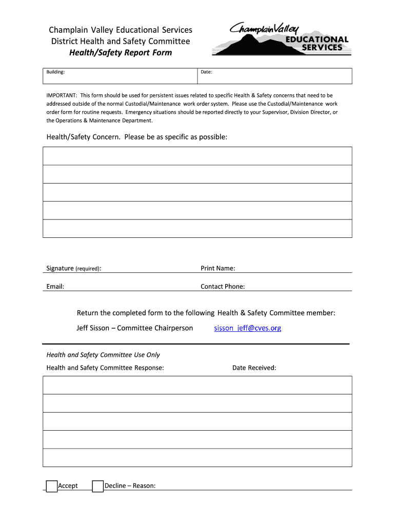 Champlain ValleyEducational Services DistrictHealthandSafetyCommittee Health/SafetyReportForm Building: Date: IMPORTANT: ThisformshouldbeusedforpersistentissuesrelatedtospecificHealth&Safetyconcernsthatneedtobe