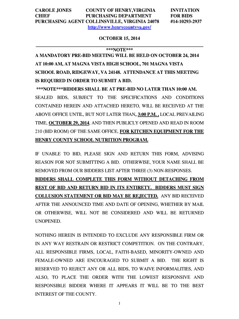 CAROLE JONES COUNTY OF HENRY, VIRGINIA CHIEF PURCHASING DEPARTMENT PURCHASING AGENT COLLINSVILLE, VIRGINIA 24078 http://www.henrycountyva.gov/ INVITATION FOR BIDS #14102932937 OCTOBER 15, 2014 ***NOTE***