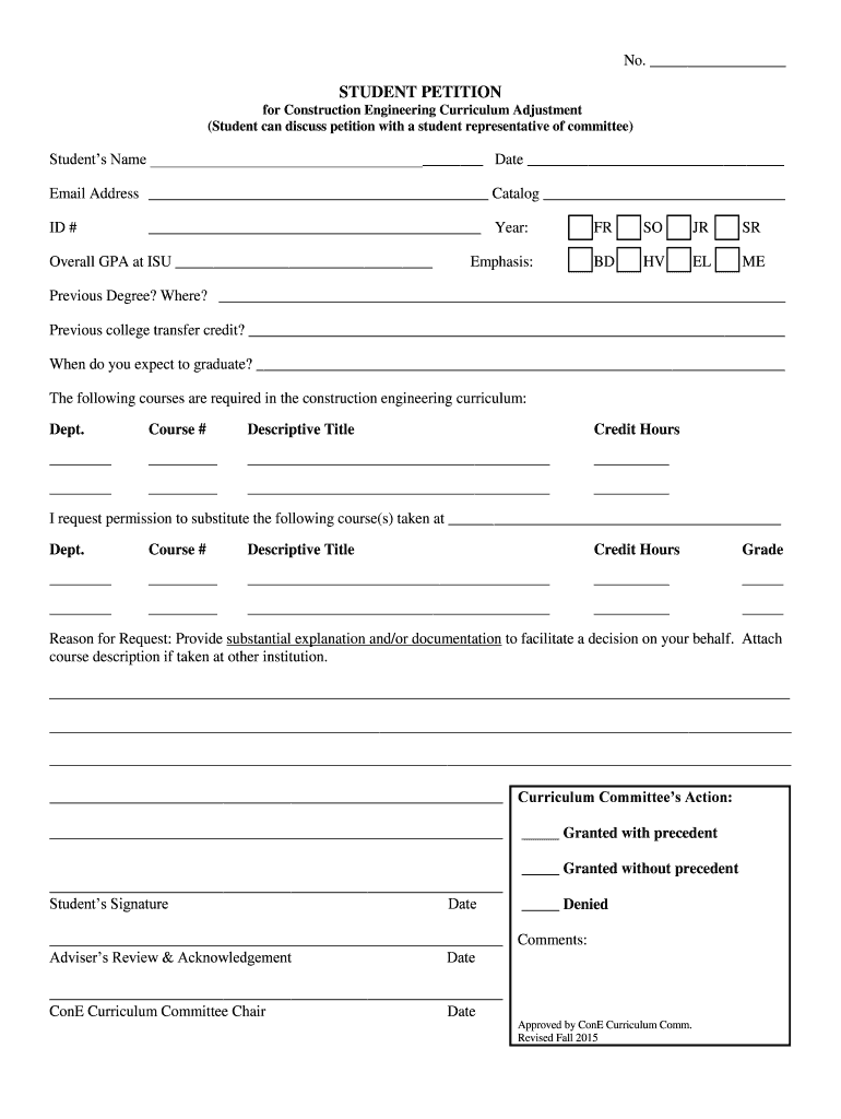 No. STUDENT PETITION for Construction Engineering Curriculum Adjustment (Student can discuss petition with a student representative of committee) Students Name Date Email Address Catalog ID # Year: