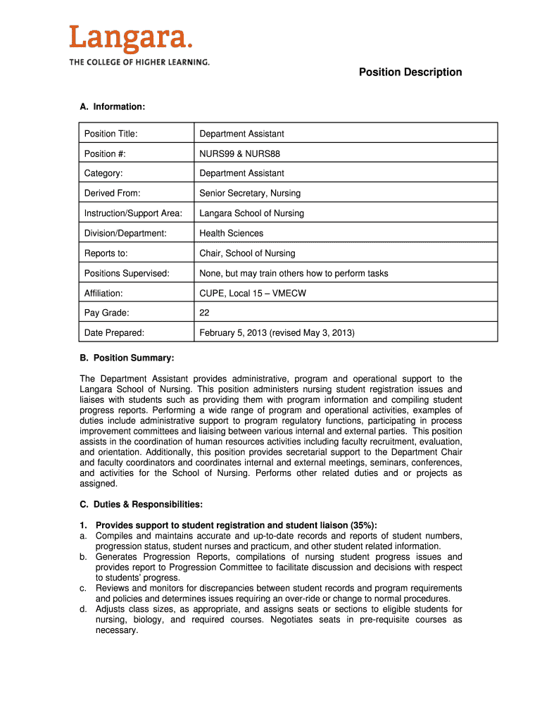 Position Description A. Information: Position Title: Department Assistant Position #: NURS99 & NURS88 Category: Department Assistant Derived From: Senior Secretary, Nursing Instruction/Support Area: