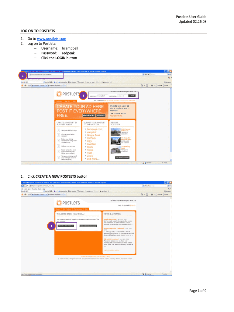 PostletsUserGuide Updated02.26.08 LOGONTOPOSTLETS 1. 2. Motown.postlets.com LogontoPostlets: Username: Campbell Password: red peak ClicktheLOGINbutton 1 2 1. ClickCREATEANEWPOSTLETSbutton 1 Page1of9