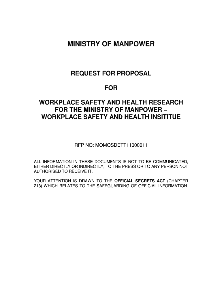 MINISTRY OF MANPOWER REQUEST FOR PROPOSAL FOR WORKPLACE SAFETY AND HEALTH RESEARCH FOR THE MINISTRY OF MANPOWER WORKPLACE SAFETY AND HEALTH INSTITUTE RFP NO: MOMOSDETT11000011 ALL INFORMATION IN THESE