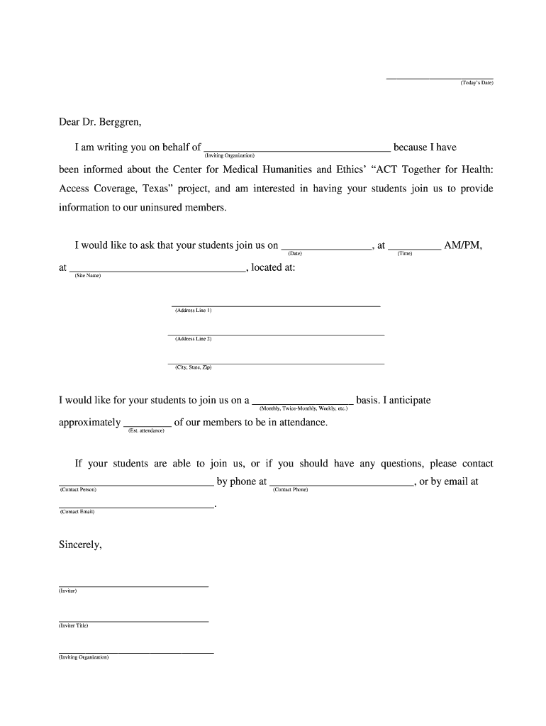 (Today's Date) Dear Dr. Bergen, I am writing you on behalf of because I have (Inviting Organization) been informed about the Center for Medical Humanities and Ethics ACT Together for Health: Access