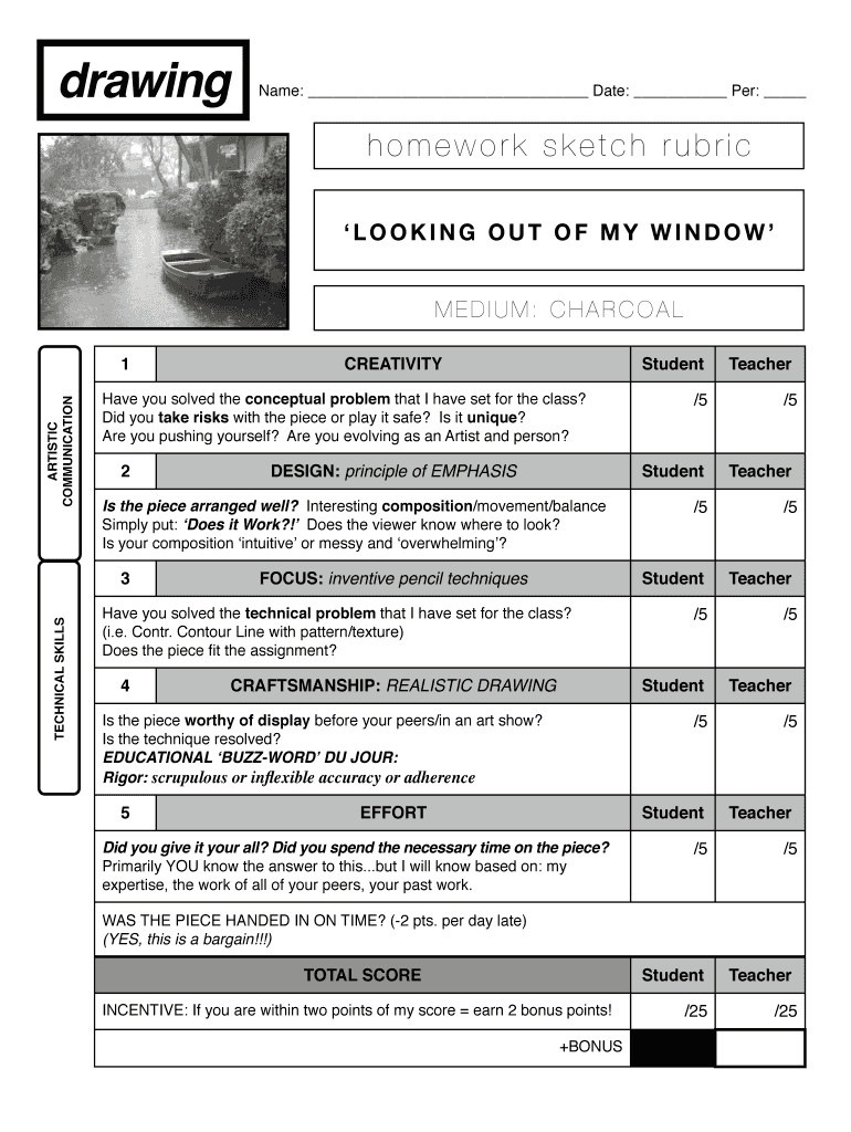 Drawing Name: Date: Per: homework sketch rubric LOOKING OUT OF MY WINDOW MEDIUM: CHARCOAL ARTISTIC COMMUNICATION 1 Student Have you solved the conceptual problem that I have set for the class? Did