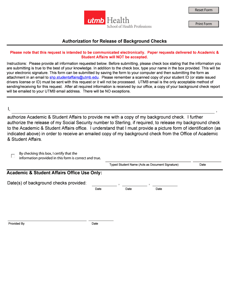 Reset Form Print Form Authorization for Release of Background Checks Please note that this request is intended to be communicated electronically. Paper requests delivered to Academic & Student Affairs