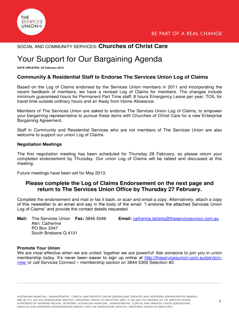 SOCIAL AND COMMUNITY SERVICES: Churches of Christ Care Your Support for Our Bargaining Agenda DATE UPDATED: 22 February 2013 Community & Residential Staff to Endorse The Services Union Log of Claims