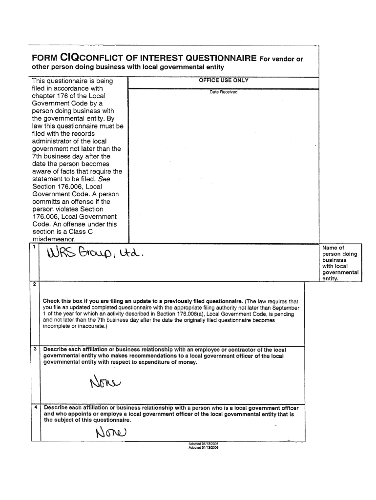 Questionnaire is being This with local governmental or entity USE ONLY OFFICE filed in accordance with chapter 176 of the Local vendor For QUESTIONNAIRE INTEREST OF CONFLICT FORM other person doing