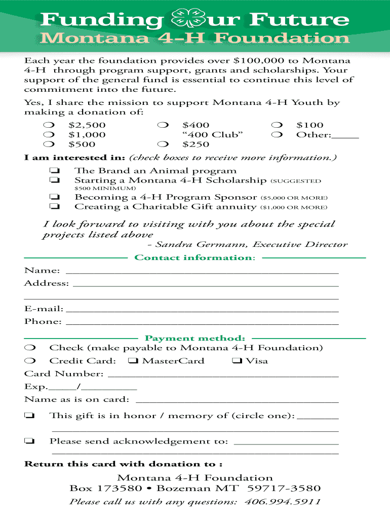 Funding your Future Montana 4H Foundation Each year the foundation provides over $100,000 to Montana 4H through program support, grants and scholarships. Your support of the general fund is essential