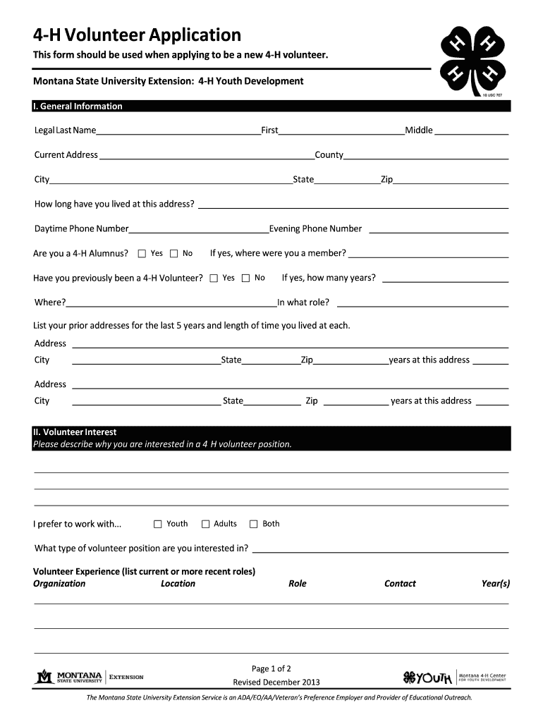 4H Volunteer Application This form should be used when applying to be a new 4H volunteer. Montana State University Extension: 4H Youth Development I. General Information Legal Last Name First Middle