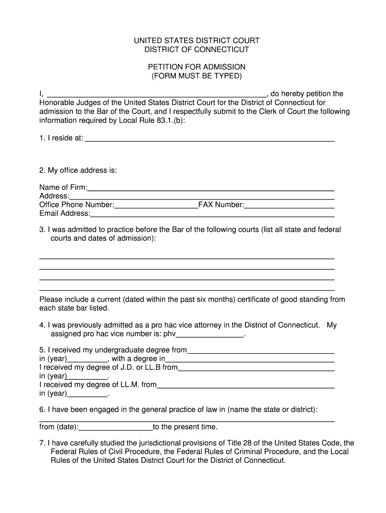 (FORM MUST BE TYPED). I, do hereby petition the. Honorable Judges of the United States District Court for the District of Connecticut for admission to the Bar ...