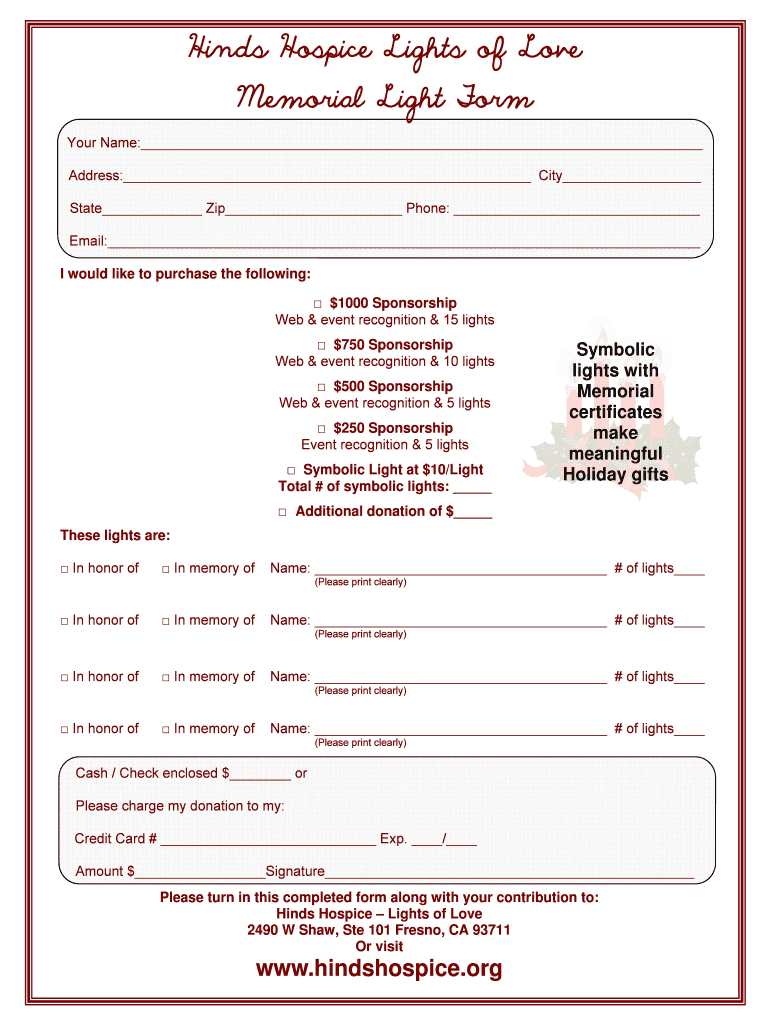 Hinds Hospice Lights of Love Memorial Light Form Your Name: Address: City State Zip Phone: Email: I would like to purchase the following: $1000 Sponsorship Web & event recognition & 15 lights $750
