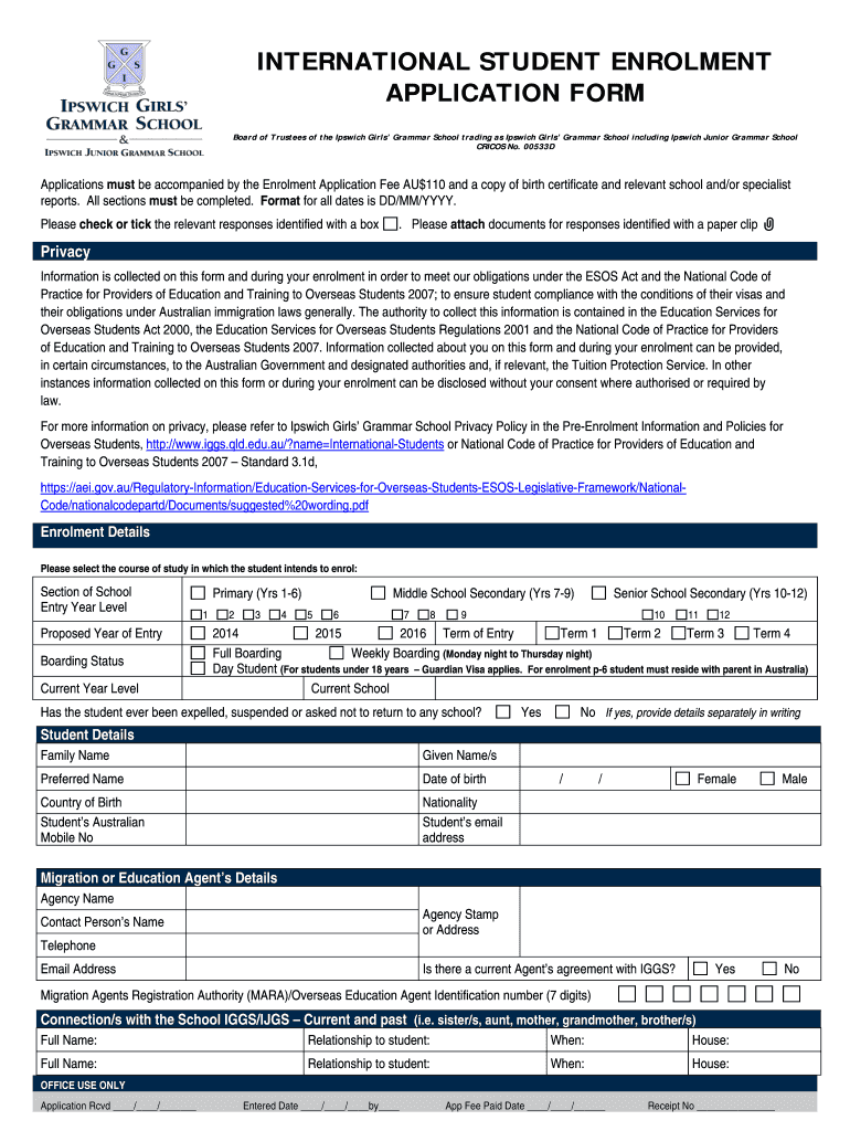 INTERNATIONAL STUDENT Enrollment APPLICATION FORM Board of Trustees of the Ipswich Girls Grammar School trading as Ipswich Girls Grammar School including Ipswich Junior Grammar School CRICKS No. 00533D